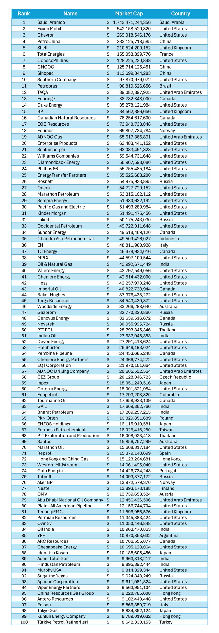 To meet that global demand requires the efforts of many of the world’s largest corporations. The following list – taken from data posted to the CompaniesMarketcap.com website – highlights the 100 largest oil and gas companies in the world, ordered by market capitalization. While #1 on the list, Saudi Aramco, has a market cap approaching $2 trillion (yes, that trillion with a T), even #100 still boasts a multi-billion dollar market cap. Clearly, meeting the world’s energy and manufacturing demands is big business.